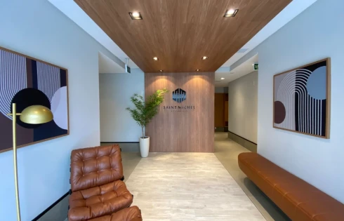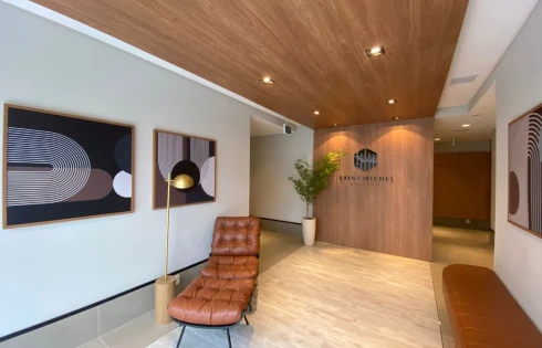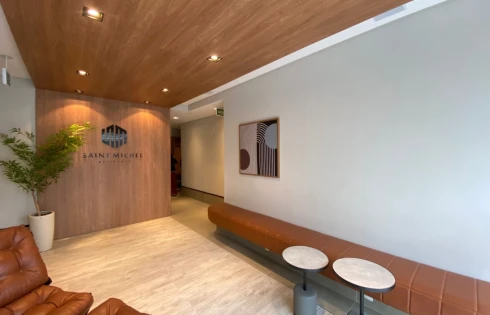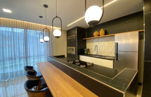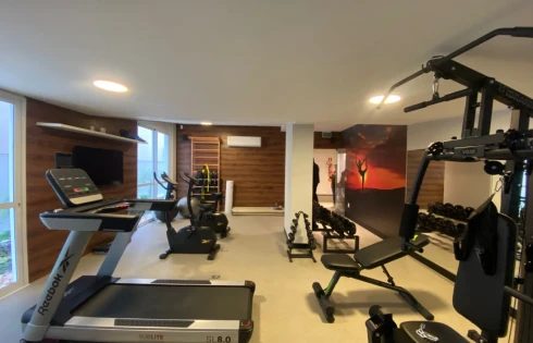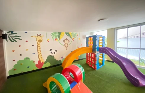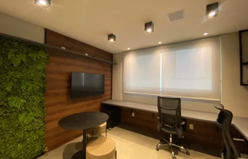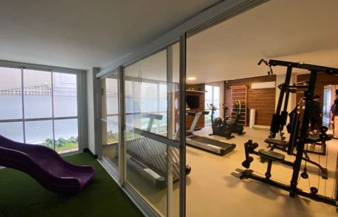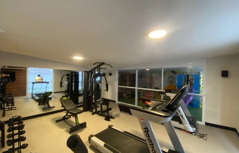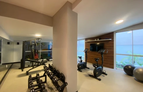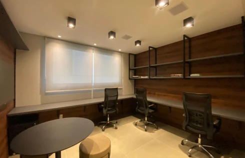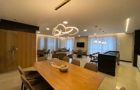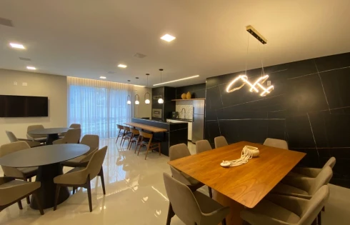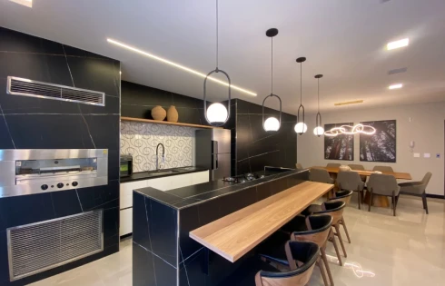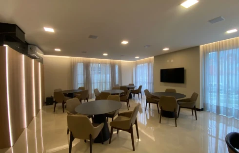 O condomínio conta com uma área de lazer e convivência mobiliada, decorada, equipada e climatizada.