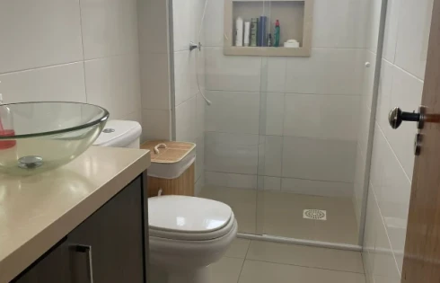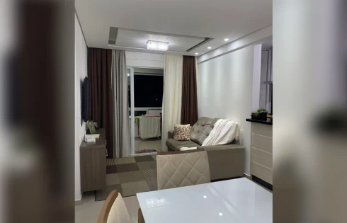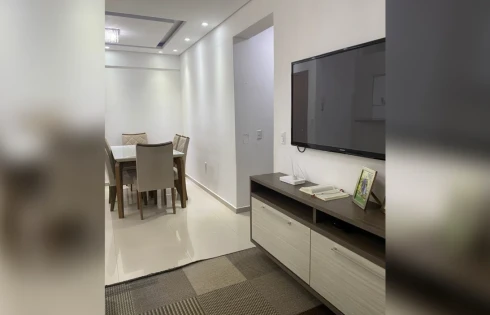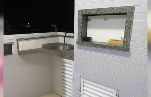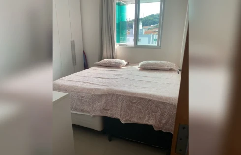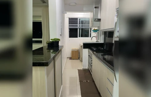 Apartamento 2 quartos em Forquilhinha, São José com 70m² privativos e sacada com churrasqueira. O imóvel possui 2 dormitórios sendo 1 suíte, banheiro social, sala ampla com 2 ambientes, cozinha, área de serviço e 1 vaga de garagem. Conta com móveis planejados embutidos, ar condicionado, vista livre e localização em andar alto com sol da tarde.