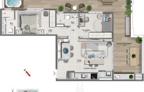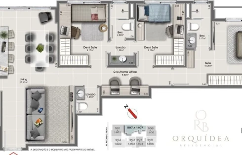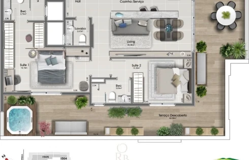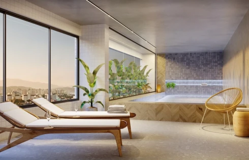 - Coberturas planas com terraço privativo de 2 dormitórios (um suíte) e de 2 suítes + lavabo.