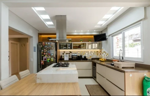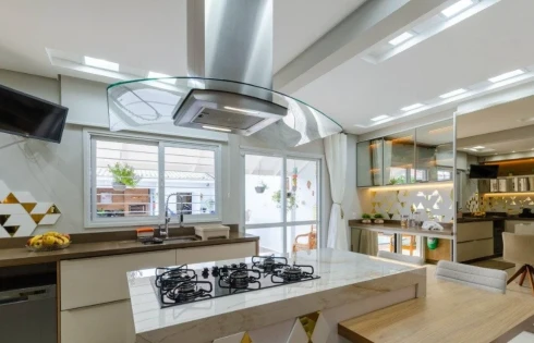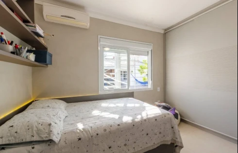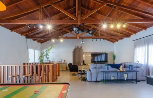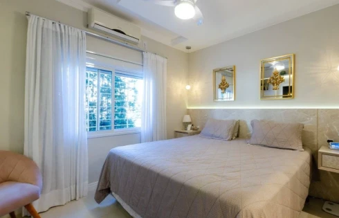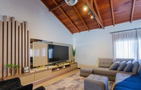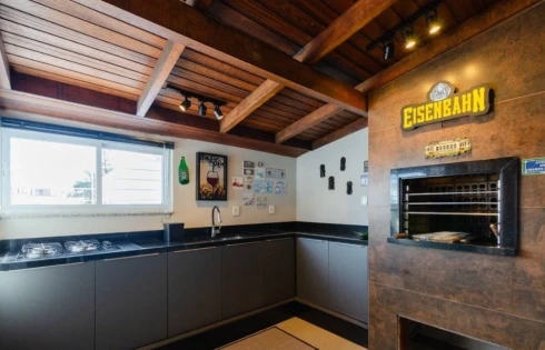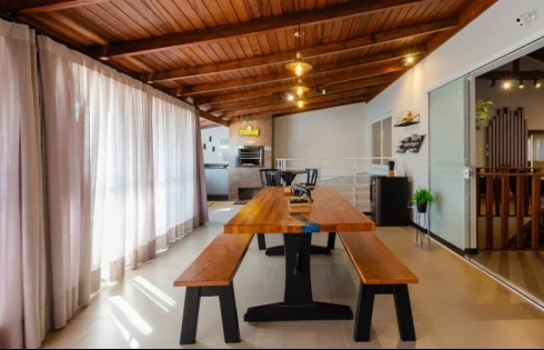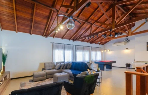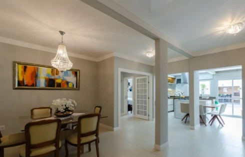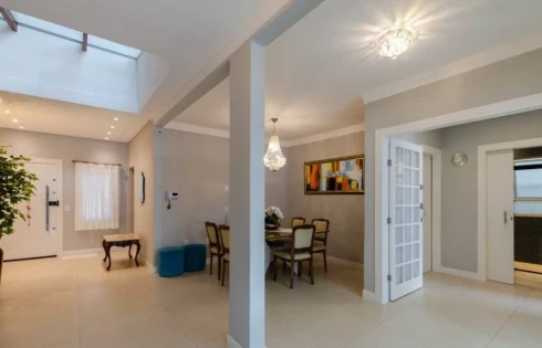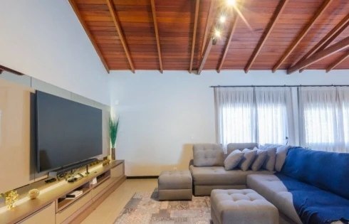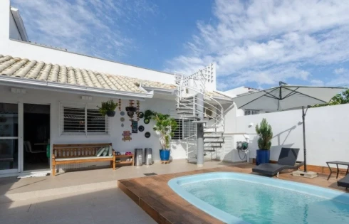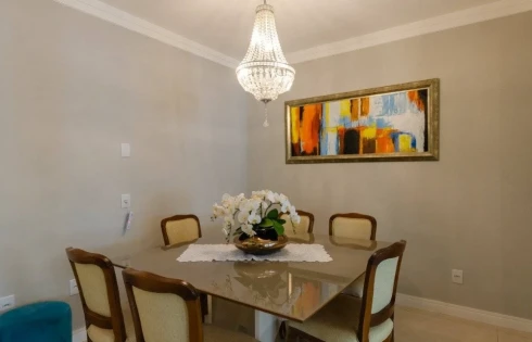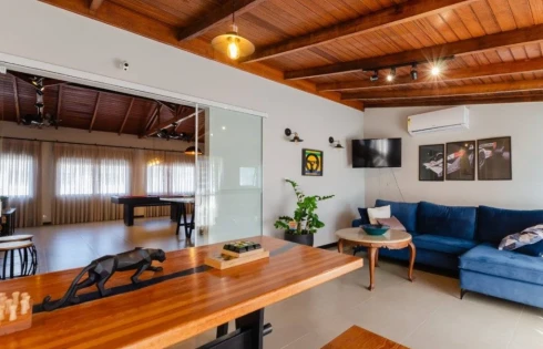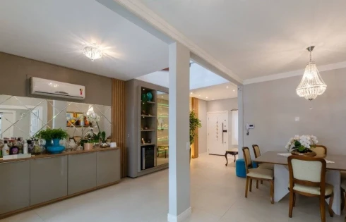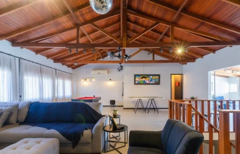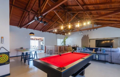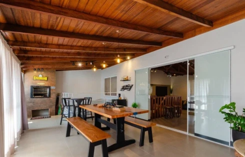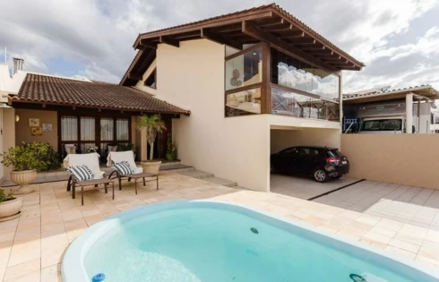 Casa 3 quartos em Balneário, Florianópolis com 384m² e sistema de energia fotovoltaica com 19 placas solares. O imóvel possui 3 dormitórios sendo 1 suíte, 3 banheiros, 3 vagas de garagem, ampla sala de jantar com clarabóia de vidro, cozinha gourmet com pedra em quartzo, salão de jogos climatizado e área de churrasqueira na piscina. A propriedade é 100% mobiliada com móveis planejados, porcelanato, metais Docol, janelas de alumínio com persiana integrada e cabeamento de rede CAT5 em todos os cômodos.